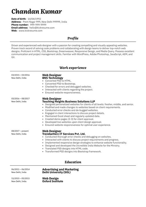web designer resume sample for freshers